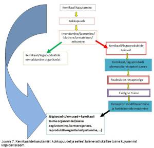 Joonis 7. Kemikaalide kasutamist, elustikuga kokkupuudet ja sellest tulenevat toksilise toime kujunemist kirjeldav skeem